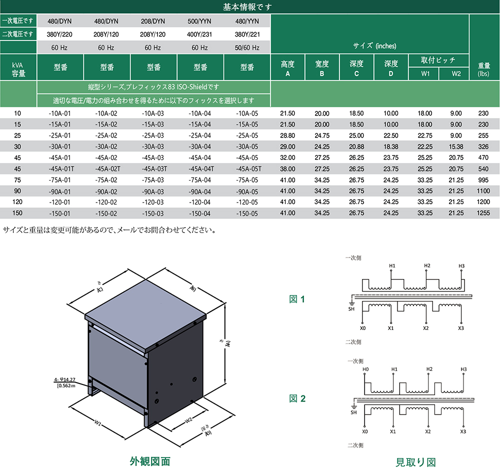 • 銅またはアルミニウムの巻線はNEMA 圧縮端子またはリング端子用の標準穴を備えたバスバー端子に接続します